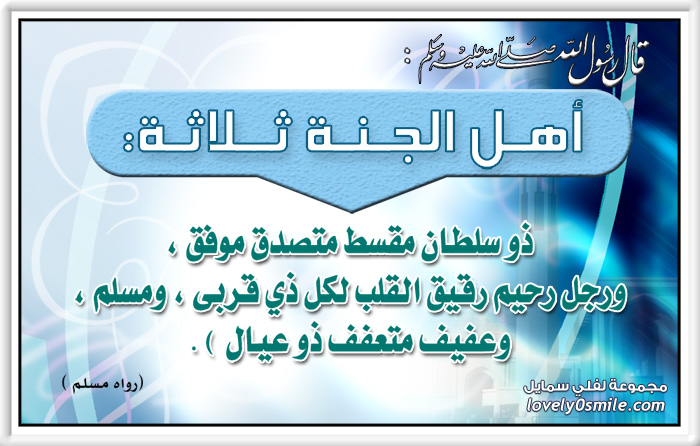أهل الجنة ثلاثة ذو سلطان مقسط متصدق موفق ورجل رحيم رفيق القلب لكل ذي قربى ومسلم وعفيف متعفف ذو عيال لفلي سمايل