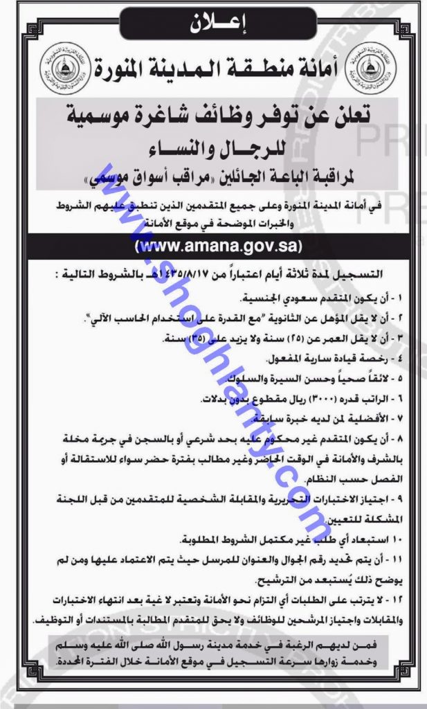 وظائف امانة المدينة المنورة وظائف موسمية صيفية 1435 رواتب 3000 ريال مراقب اسواق موسمي