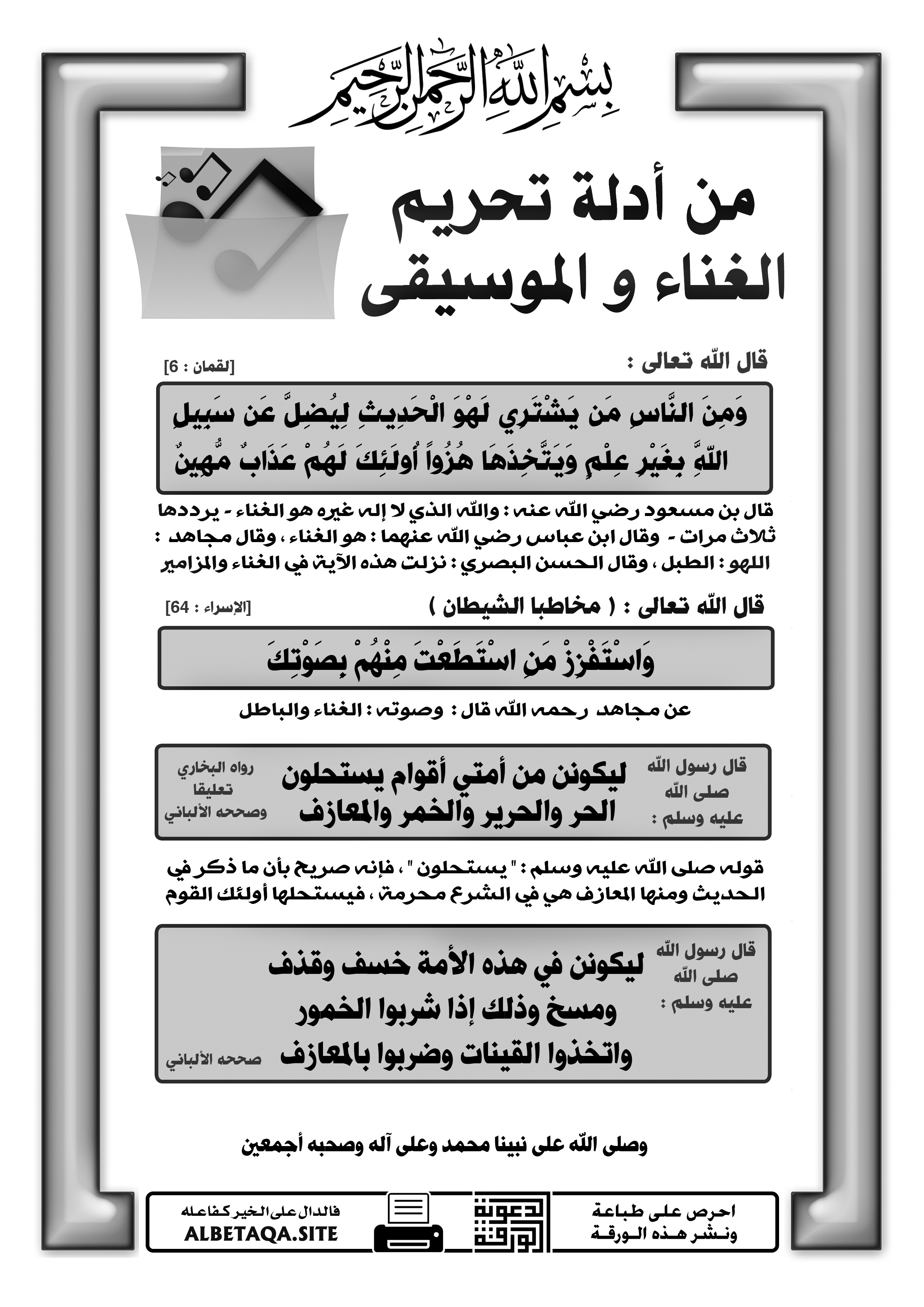 من أدلة تحريم الغناء والموسيقى موقع البطاقة الدعوي